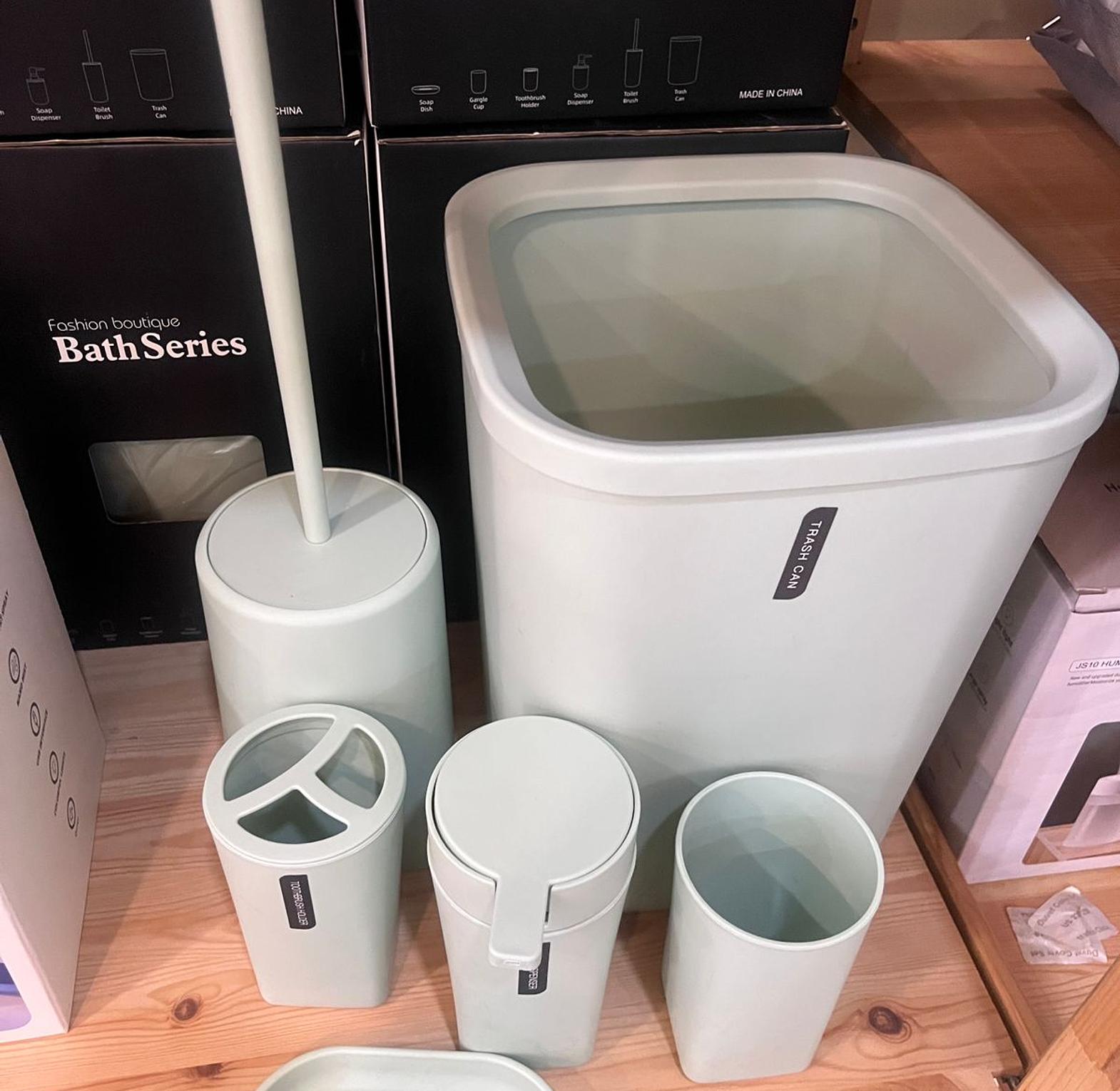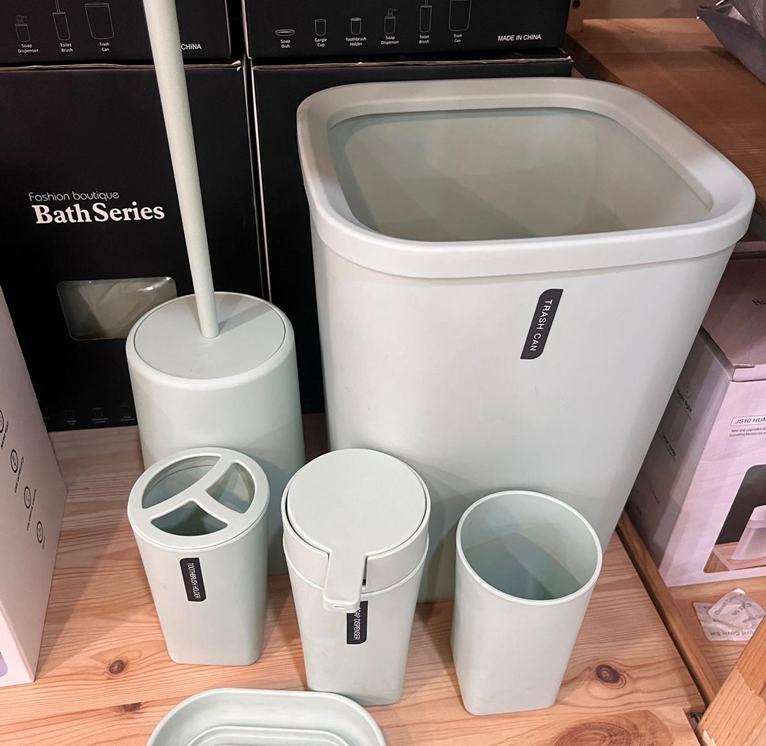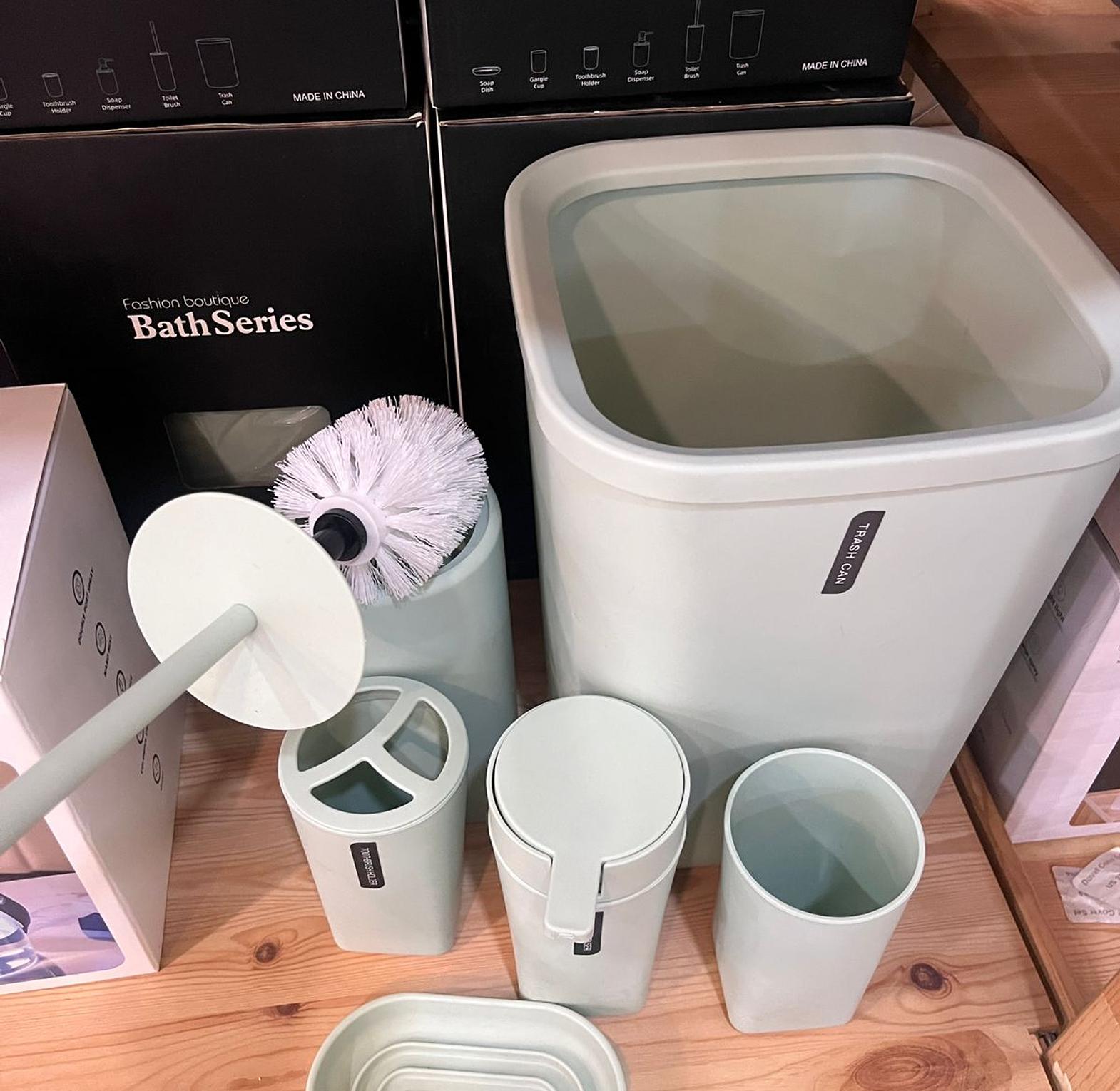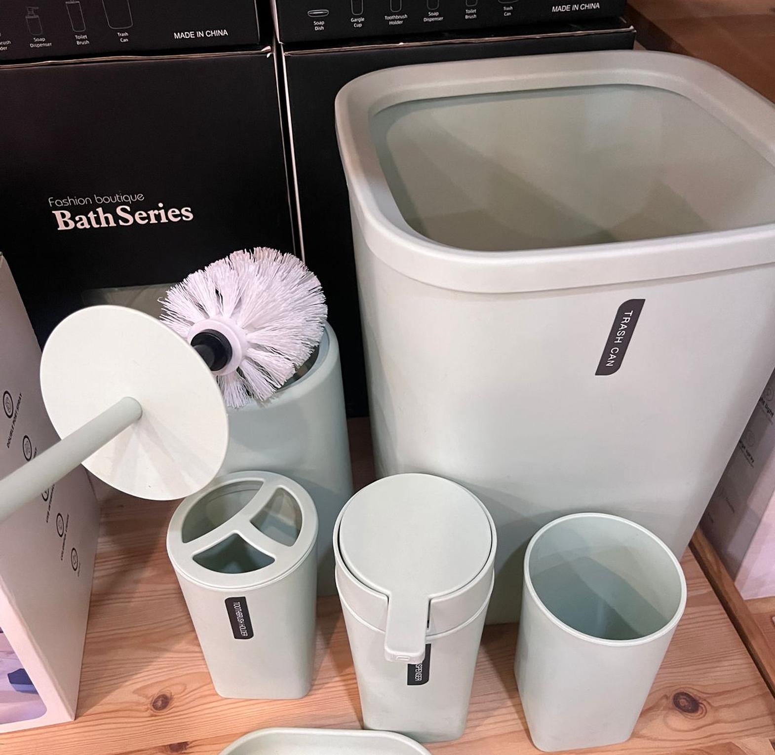 Lotion/Soap Dispenser, Gargle cup, Soap Dish, Toothbrush holder, Toilet Brush, Trash Can
